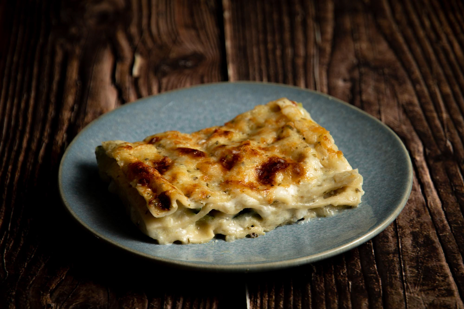 Adesso non vi resta che comporre le vostre lasagne. In una teglia stendete la besciamella al pesto, poi uno strato di pasta, le zucchine, uno strato di besciamella, e di nuovo uno strato di pasta, le zucchine e la besciamella. Terminate con una bella grattata di parmigiano.