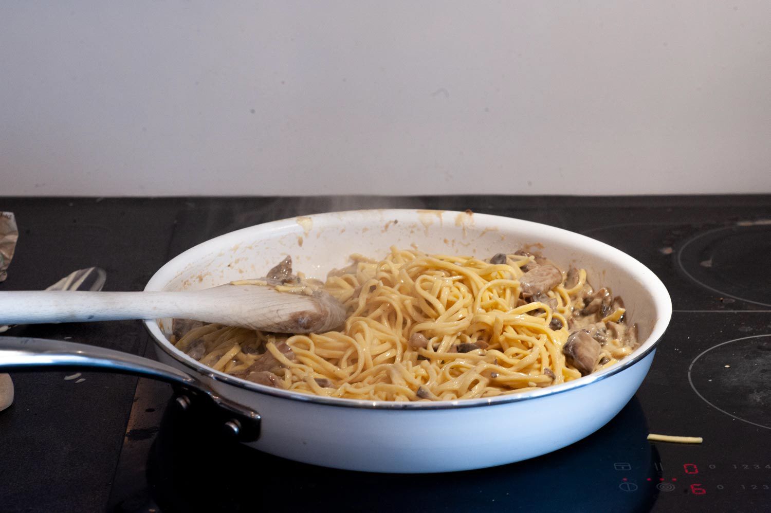Quando i funghi hanno perso tutta l’acqua, unite la panna e appena la pasta è cotta scolatela e versatela in padella.